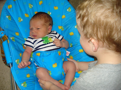 It seems like we just had Owen, but also it seems like it has been six months already. I guess it is because of lack of sleep. At the doctor he already weighed 12 lb 10 oz, we think he's going to be big like Tagg. Guess we will see. Our little guy has been really gassy and the Dr said colicky. Which I can tell you is no fun especially at night. You feel completely helpless to soothe him when he just screams out loud and won't stop. We have tried the gas drops, gripe water, and are just going to be starting a prescription for reflux. I haven't noticed anything to help him out a whole lot:(. Last night was horrible, he wouldn't stay asleep for about a 4 hour span. I have heard that chiropractors help with infants and these symptoms, so I spent all of yesterday afternoon trying to find one who accepted our insurance. I found out today that our insurance only covers for children ages 6-20, so we are out of luck with that. I am praying that the medicine helps, so he and (mom and dad) can have some relief:). Owen is already wearing 3 month and some 3-6 month clothing, almost ready to switch to size 2 diapers, and is just getting more and more chunky by the day. He usually wakes up every 2 to 2 1/2 hours to eat in the night, I am excited for the day when that gets farther apart! He's starting to smile at us and loves when we talk to him. Taggart is so cute with him, because he just goes and sits by him and stares and rubs his legs or head. We can't wait til they can actually play together!